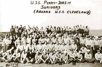 Survivors of the sunken USS Perry, after their rescue by the USS Cleveland.