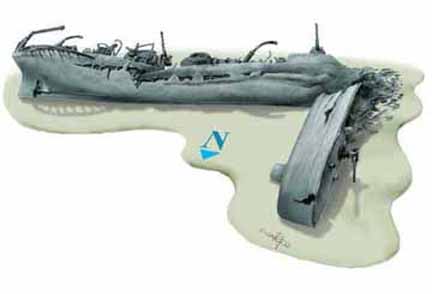 but the destroyer broke in half. It lies on its side, still connected